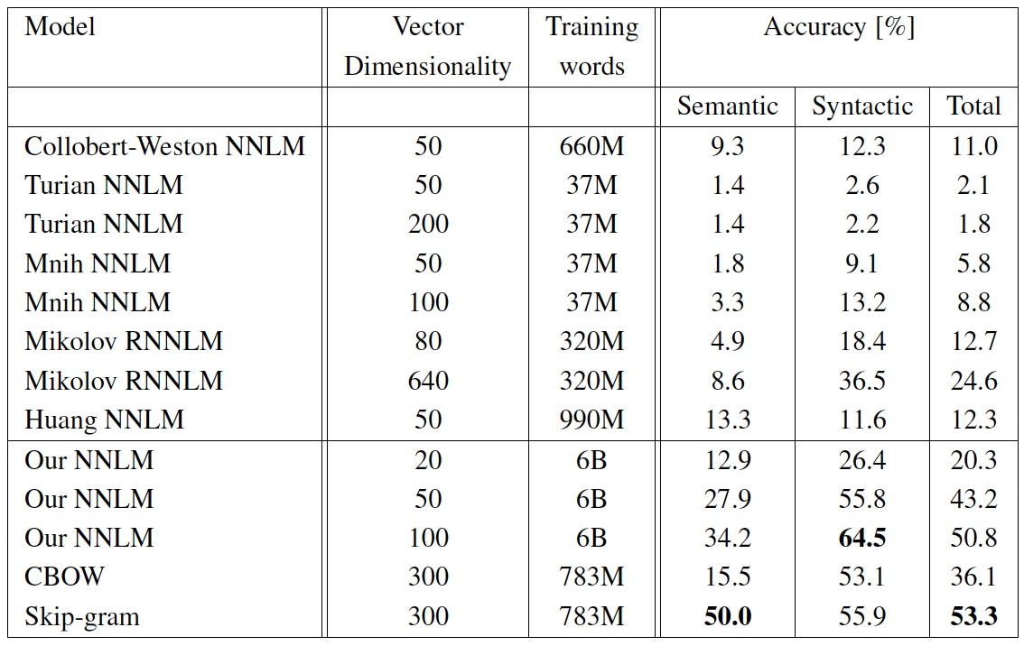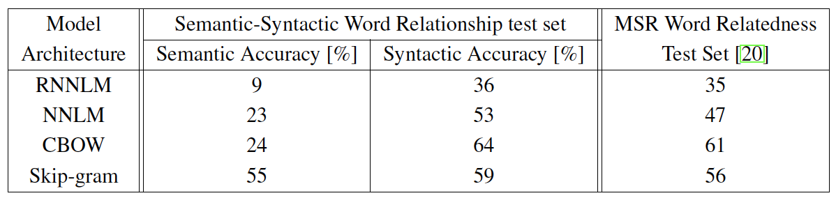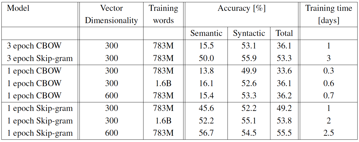 - 비교에 사용된 CBOW 모델을 Google News에 대해서 하루 동안 학습되었고, Skip-gram 은 3일 정도 학습되었다.