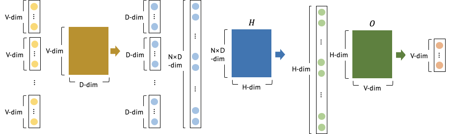 - N 개의 이전 단어들이 1-of-V coding(one-hot-vector)으로 인코딩된다. (V 는 전체 단어의 수)