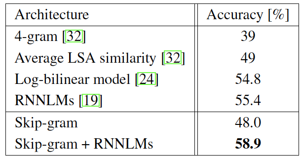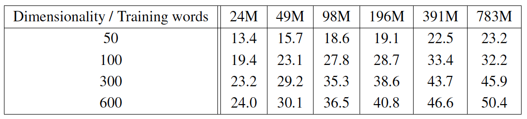 - Semantic-Syntactic Word Relationship test set 에 대한 성능을 비교했다.
