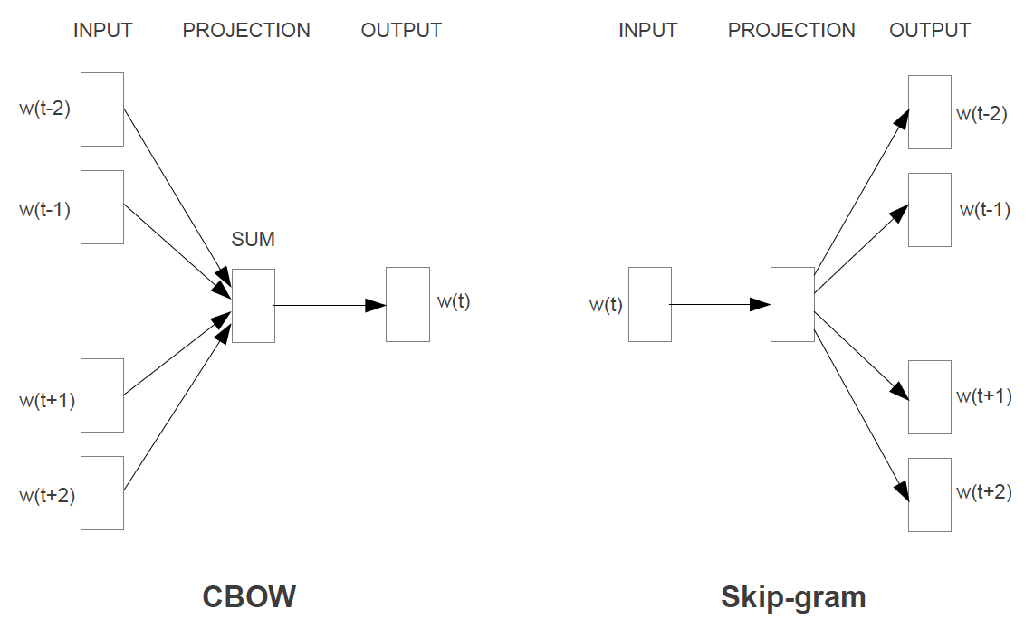 - feedforward NNLM 과 유사하지만, non-linear hidden layer가 모두 제거되고 projection layer가 모든 단어들과 공유된다.