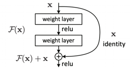 [그림-5]는 ResNet의 구조이다. ResNet의 경우, skip-connection을 이용해서 direct connection을 생성한다. 입력으로 들어오는 값 x를 convolution layer를 지나고 나온 결과에 더해줘서 과거의 내용을 기억할 수 있도록 한다.