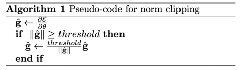 [식-1]을 보면 gradient와 learning rate을 이용해서 파라미터 값을 업데이트하는 식을 확인할 수 있다. 이때, gradient의 값이 너무 커지는 경우, 한 번에 큰 업데이트를 진행하게 되어서 Inf나 Nan과 같은 잘못된 결과를 제공할 수 있다. 이러한 문제점은 Gradient Clipping이라는 방식으로 해결할 수 있다.