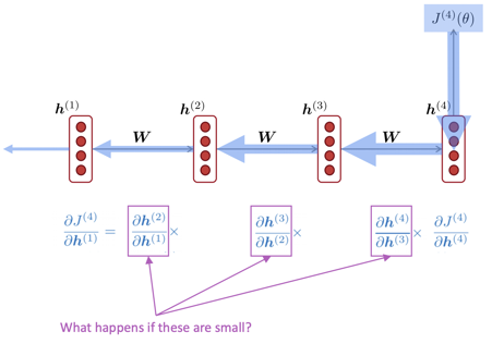 위 그림에서 $ h^1 $ 의 관점에서 보겠다. $ J^2 $ 에 대한 gradient의 값은 $ J^4 $ 에 대한 gradient값 보다 훨씬 클 것이다. 그러므로, $ h^1 $ 은 $ J^2 $ 에 맞게 학습될 것이다. 다른 말로 표현하면, 파라미터들은 가까이에 위치한 dependency에 맞게 학습하고, 멀리 떨어진 dependency 에 대해서는 학습하지 못한다는 뜻이다.