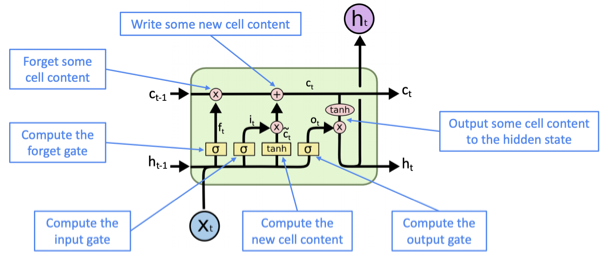 - $ c $ : 이전 cell state에서 유지되어야 할 값이 forget gate를 통해서 유지되고, 새로 생성된 cell content의 값 중 기록해야 할 값을 output gate를 통해서 기록된다.