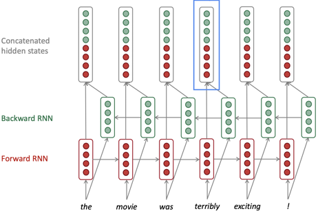 기존의 Vanilla RNN처럼 단방향으로 입력을 받는다면, "terribly"라는 단어를 먼저 접하게 되고, 그렇다면 문장 전체가 부정적인 문장일 것이라는 판단을 하게 된다. 하지만, 뒤에 오는 "exciting"이라는 단어 때문에 문장은 긍정적인 문장으로 해석된다. 이렇게 우리는 뒤에 오는 데이터를 함께 파악해야 하는 필요성이 생겼고, Bidirectional RNN은 그러한 역할을 수행한다. Forward RNN은 정방향으로 입력을 받아서 hidden state를 생성하고, backward RNN은 역방향으로 입력을 받아서 hidden state를 생성한다. 두 RNN이 생성한 hidden state를 연결해서 전체 모델의 hidden state로 사용하게 된다. 해당 동작을 식으로 표현하면 다음과 같다.