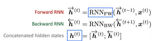 위의 식에서 사용되는 RNN은 그냥 vanila RNN을 사용해도 되고, LSTM, GRU와 같이 다양한 RNN의 종류를 사용해도 된다. Bidirectional RNN은 전체 입력 데이터를 보유하고 있는 경우 강력한 성능을 보여준다. 하지만, 전체 데이터가 없는 경우 사용할 수 없다. 그렇기 때문에 빈칸에 오는 단어를 예측해야 하는 Language Modeling에서는 사용할 수 없다.
