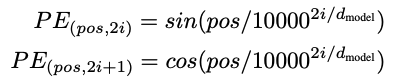 $ pos $ 는 위치(position)를 나타내고, $ i $ 는 차원을 나타낸다. Sinusoid의 형태를 갖추는데, $ 2\pi ~ 10000 * 2 \pi $ 의 주기를 갖게 된다. 우리는 상대적인 위치를 기반으로 attend 하면 더 빠르게 학습할 수 있을 것이라고 예측했다. $ PE_{pos+k} $ 의 값은 $ PE_{pos} $ 값의 linear 연산을 통해서 구할 수 있기 때문이다.