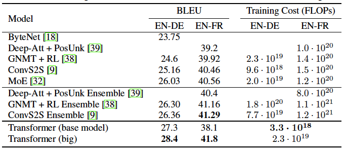 WMT 2014 English-to-German translation task에 대해서 big transformer model은 이전에 최고 성능을 보여줬던 모델을 뛰어넘는 성능을 보여줬다. BLEU 점수를 2.0 정도 증가시키면서 SOTA BLEU score (28.4점) 를 제공했다. 8 P100 GPU를 이용해서 3.5일 동안 학습을 진행했다. WMT 2014 English-to-French translation task에서는 big transformer model 은 1/4의 학습 비용만으로 이전에 최고 성능의 모델들을 뛰어넘었고, 41.0 BLEU 점수를 제공했다. Big model의 경우 마지막의 20개 체크포인트를 평균해서 사용했고, Base model 의 경우, 한 개의 모델만을 이용해서 10분 간격으로 5개의 체크포인트를 유지했다. Beam size = 4 로 해서 beam search 를 진행했다.