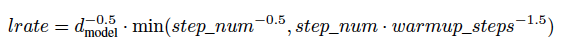 학습하는 과정에서 Adam Optimizer를 이용했다. warmup_steps 동안에는 학습률을 증가시키다가, 이후에는 감소시켰다.