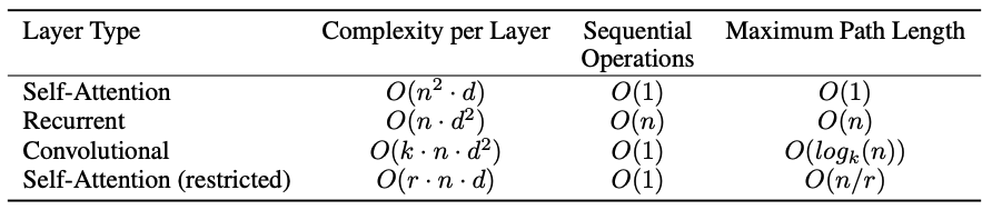 [표-1]을 보면, self-attention layer는 각 위치를 상수 횟수의 sequential operation으로 처리한다. 반면에 recurrent layer는 $ O(n) $ 의 seqential operation을 수행하게 된다. Computational complexity를 고려했을 때, sequence의 길이 $ n $ 이 representation의 차원 $ d $ 보다 작은 경우 self-attention layer는 recurrent layer 보다 빠르게 연산될 수 있다. Machine translation task를 수행하는 SOTA 모델들은 대부분 이러한 조건을 만족한다. 매우 긴 sequence 에 대해서 성능을 유지하기 위해서는 self-attention은 두변의 $ r $ 개의 이웃된 요소들에 대해서만 수행되어야 한다. 이런 경우 최대 path length 는 $ O(n/r) $ 이 될 것이다. 그 외에도, self-attention은 interpretable model을 제공한다. 각 attnention은 서로 다른 특징을 학습하고, syntactic, semantic 구조를 이해할 수 있도록 한다.
