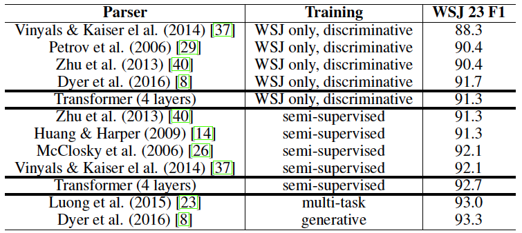 Transformer가 일반적인 task에 사용될 수 있을지 확인하기 위해서 English constituency parsing에 적용시켜 보았다. Output이 input보다 훨씬 길다는 문제를 해결해야 하는 task이다. 우리는 4-layer model dimension = 1024 인 Transformer를 Penn TreeBank의 일부인 Wall Street Journal(WSJ) 부분에 대해서 학습했다. [표-4]를 보면, 특정한 task에 대해서 튜닝을 진행하지 않았어도 좋은 성능을 제공한다는 것을 알 수 있었다.