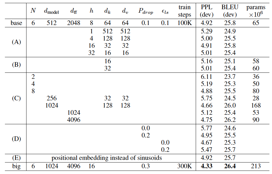 [표-2]에서 (B)는 key size가 모델의 성능에 영향을 미친다는 것을 나타낸다. 또한, (C)와 (D)에서는 당연하게도 큰 모델들의 성능이 더 좋고, overfitting을 예방하기 위해서 dropout이 효과적이라는 것을 나타낸다. (E)에서는 기존의 sinusodial positional encoding을 learned positional embedding으로 교체한 결과이고, 기존의 성능과 유사하다는 것을 알 수 있었다.