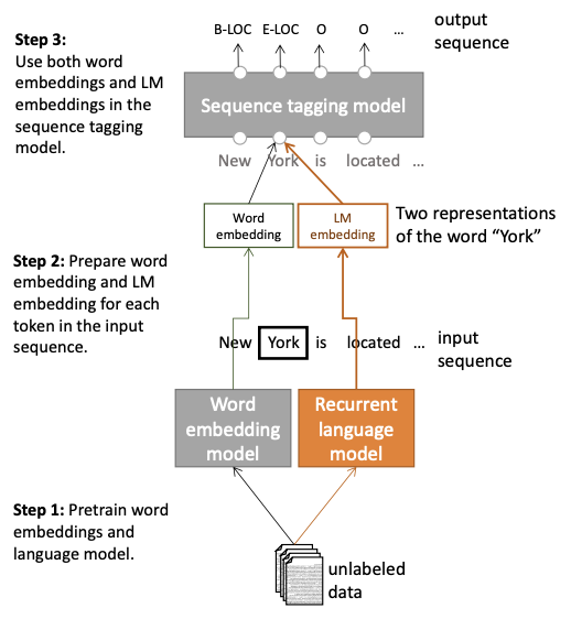 이번 논문에서는 레이블링된 데이터가 필요 없는 semi-supervised 방식을 제안한다. 레이블링하지 않은 큰 데이터에 대해서 pre-trained 된 Neural Language Model (LM) 을 사용해서 해당 위치에서의 문맥을 고려한 인코딩을 생성한다. LM embedding은 미래에 나타날 단어들을 예측하기 때문에, 단어의 의미와 단어의 문법적인 특성을 모두 인코딩할 수 있다. 이번 논문에서는 LM embedding 이 sequence tagging task에서 성능 향상을 가져올 수 있다는 것을 보인다. 또한, forward LM만 사용하는 것보다 forward/backward LM을 함께 사용하는 것이 더 좋은 성능을 제공한다는 것을 보인다.