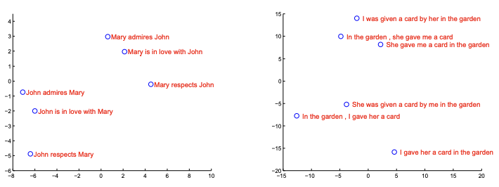 [그림-2]는 LSTM의 hidden state를 2차원 공간에 PCA projection 한 결과이다. 유사한 의미의 문장들이 인정한 공간에 투영된다는 것을 알 수 있다.