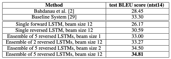 - 입력의 순서를 뒤집어서 제공한다. a, b, c, 로 구성된 문장이 있다면, 모델의 입력으로는 c, b, a 로 제공한다. 입력을 뒤집어서 제공하는 방법은 long-term dependency 를 더 잘 학습할 수 있게 한다. 이번 논문에서도 입력을 뒤집는 것이 성능에 긍정적인 영향을 끼치는 이유를 정확하게 설명하지는 못하지만, 어느정도 예측한 가설을 설명한다. 입력 문장을 뒤집어도 source word 와 target word 사이 거리의 평균을 동일하게 유지된다. 하지만, "minimal time lag" 가 크게 줄어들기 때문에 이러한 성능의 향상이 있을 수 있다고 설명한다. (minimal time lag에 관한 논문은 [참고 논문] 8번 참고)