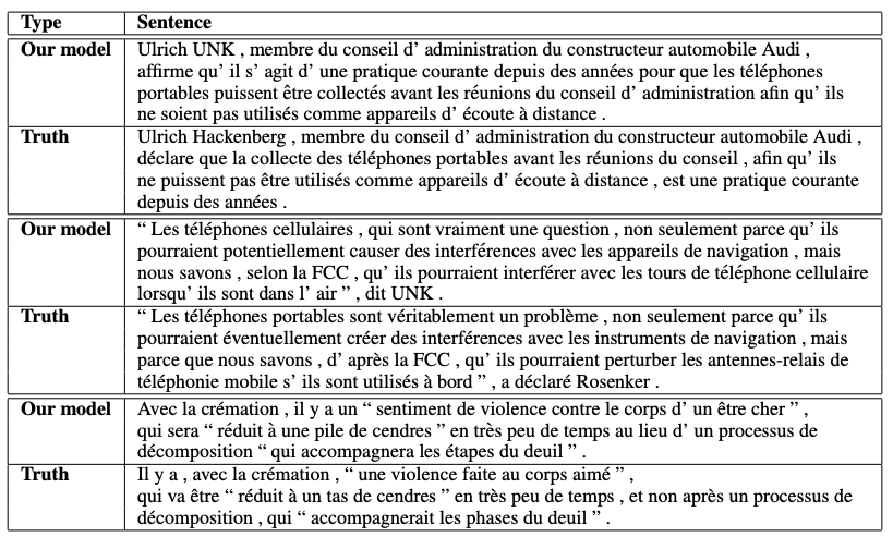 [표-3] 실제 번역 정답(Truth)과 함께 해당 모델(Our model)을 사용한 번역 결과 예시이다.