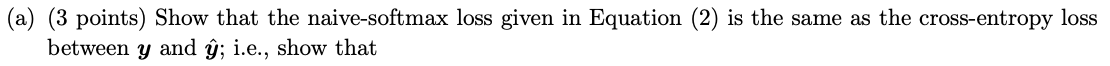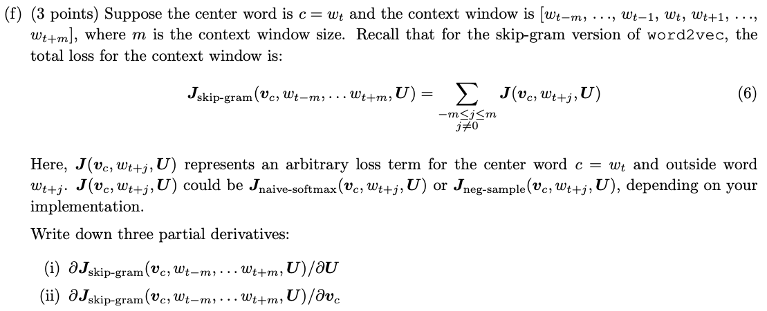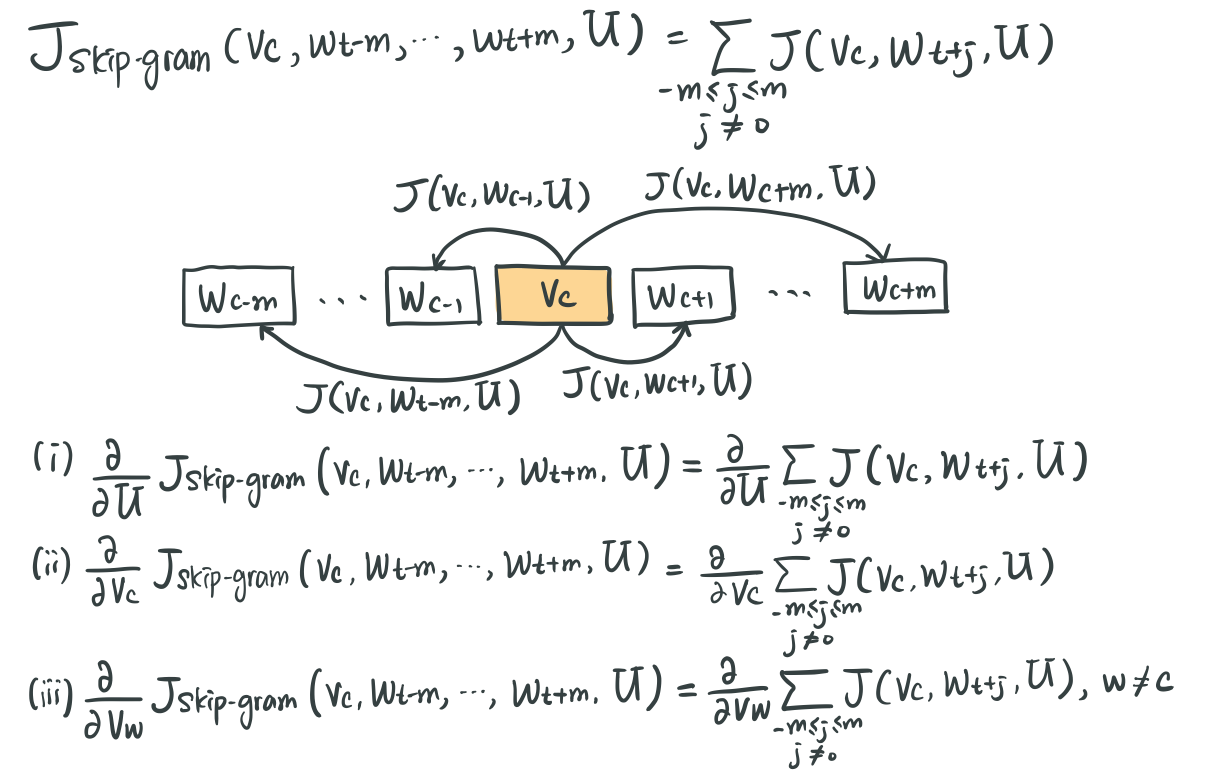 word2vec의 skip-gram 방식에 대한 과제였다. 가운데 단어(center word) $ c $ 가 주어졌을 때, $ m $ 의 window size 내에 있는 주변 단어(context word) 가 나타날 conditional probability $ P(O = o | C = c) $ 를 구한다. Loss function을 $ -logP(O = o | C = c) $ 로 정의하고, loss를 최소화하도록 context word 와 center word의 벡터를 학습한다. Loss function을 최소화하기 위해서 Loss function을 각각 context word와 center word 에 대해서 미분한 값이 0이 되도록 벡터값을 수정해 나간다.