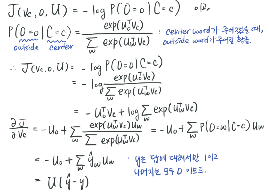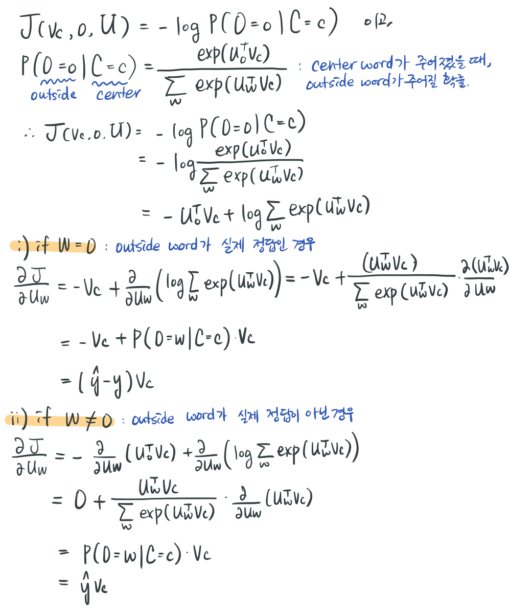 기존의 방식(naive-softmax) 보다 새로운 방식(negative sampling)의 성능이 더 좋은 이유 : naive softmax 같은 경우는 언제 vocabulary에 대해서 softmax 연산을 해야 한다는 문제가 있다. 전체 단어에 대해서 $ u^T_wv_c $ 의 연산 후 지수승을 하고 모두 더해줘야 하는데, 이러한 연산은 비용이 너무 많이 든다는 단점이 있다. 하지만, Negative sampling 의 경우, negative sample 몇 개만 뽑아서 해당 negative sample에 대한 loss function을 연산하기 때문에, 상대적으로 연산 비용이 적다는 장점이 있다.