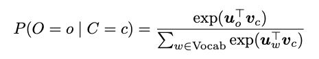 해당 Conditional probability 는 [식-1]과 같이 계산하게 된다. 이 때, $ u_o $ 는 context word vector 를 상징하고, $ v_c $ 는 center word vector 를 상징한다. 파라미터를 구분하기 위해서 두 matrix $ U, V $ 로 구분해서 사용한다. $ U $ 의 모든 column 은 주변 단어(context word) 들로 구성되어 있고, $ V $ 의 모든 column 은 중간 단어 (center word) 들로 구성되어 있다.