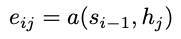Decoder : Time $ ㅑ $ 에서 decoder의 hidden state를 $ s_i $ 이라고 한다. Alignment model에서는 decoder의 time $ i $ 에서의 정보다 encoder의 time $ j $ 에서의 정보와 얼마나 연관성이 있는지 score를 계산한다. 해당 Score는 decoder 의 바로 전 time $ (i-1) $ 에서의 hidden state $ s_{t-1} $ 과 encoder의 time $ j $ 에서의 hidden state $ h_j $ 를 이용해 [식-6] 과 같은 연산을 수행한다. 이 때 alignment model 인 $ a() $ 는 feedforward neural network 라고 할 수 있다.