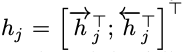 Time $ j $ 에서의 입력 $ x_j $ 에 대해서 forward hidden state $ \overrightarrow{h_j} $ 와 backward hidden state $ \overleftarrow{h_j} $ 를 연결해서 j-번째 hidden state $ h_j $ 를 생성한다. 인접한 state의 정보를 더 많이 가지고 있는 RNN의 특성상, $ h_j $는 입력 단어 $ x_j $ 의 가까운 위치에 있는 단어들의 정보를 더 많이 보유하게 된다.
