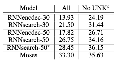 결과 : BLEU score를 기반으로 translation 성능을 평가했다. RNNsearch 가 모든 경우 더 뛰어난 성능을 제공했다. ([표-1] 참고) 또한, 기존의 phrase-based translation system(Moses) 와 유사한 성능을 제공할 수 있었다. Moses의 모델의 경우 추가적인 monolingual corpus를 사용했다는 점에서 이번 모델이 뛰어난 성능을 제공한다는 것을 알 수 있다.