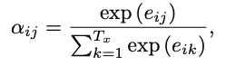 이 때, encoder의 각 hidden state에 대한 weight $ \alpha_{ij} $ 는 alignment model에서 구한 score $ e_{ij} $ 를 이용해서 [식-8]과 같이 구해진다.