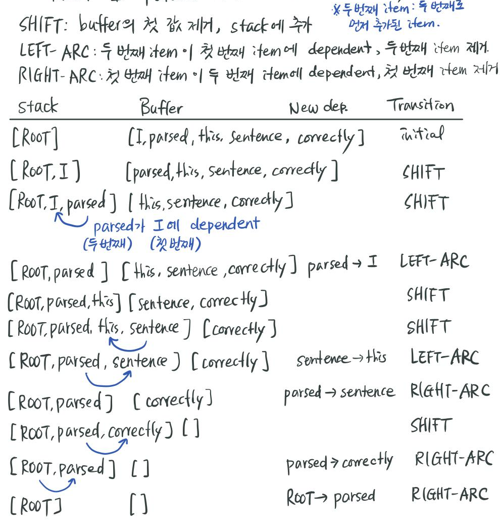 - LEFT-ARC : 가장 마지막에 추가된 단어 a 가 그 전에 추가된 단어 b 에 dependent 한 경우, a->b 의 dependency를 생성하고 b를 stack에서 제거한다.