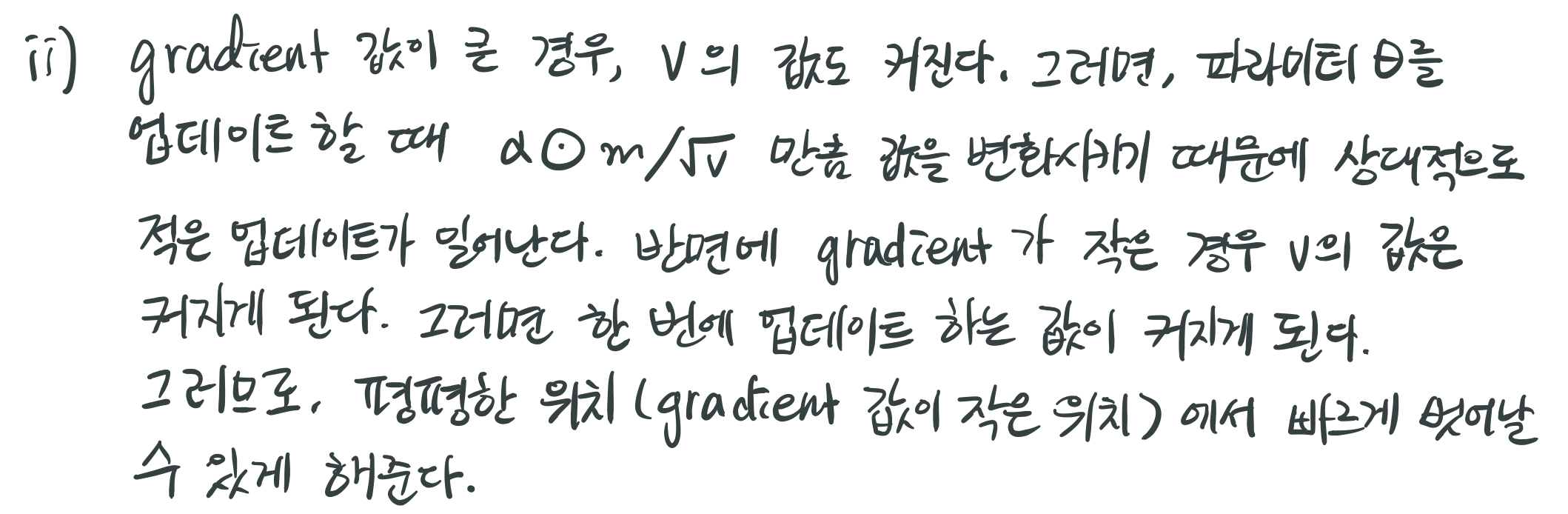Adam 이 전체 업데이트를 $ \sqrt{v} $ 로 나눠주는데, 이러한 방식으로 학습을 진행하면 어떤 파라미터가 더 크게 업데이트를 하게 되는가? 이러한 업데이트 방식이 학습에 어떠한 도움이 되는지 이야기해보자.