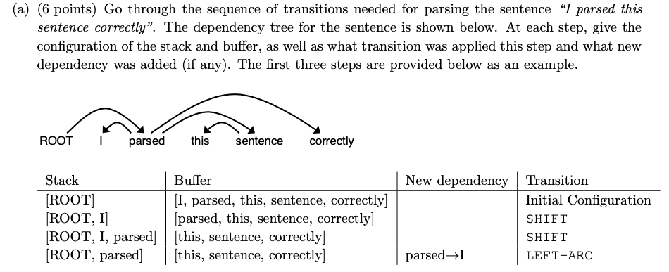Dependency parser는 각 단어들 사이의 관계를 학습하면서 문장의 문법적인 구조를 나타낼 수 있다. 이번 과제는 transition-based parser로서, 순차적으로 하나씩 parsing 해나간다. Parser는 다음과 같은 구성을 지닌다.