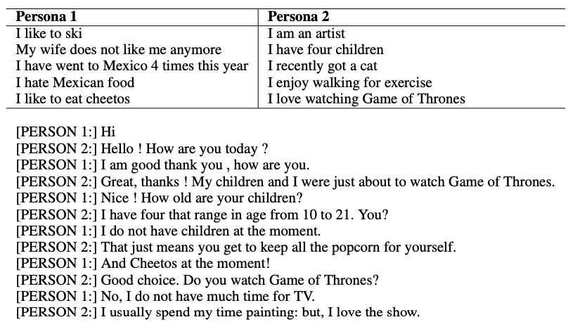 TransferTransfo는 PERSONA-CHAT dataset을 통해서 학습한다. PERSONA-CHAT dataset은 두 사람이 서로에 대해서 알아가는 대화를 기록한 데이터셋인데, 조금 특별한 점은 대화에 참여하는 두 사람에 대한 profile이 몇 개의 문장으로 정의된다는 것이다. [표-1]을 보면, Persona 1, Persona 2 에 대한 profile이 각각 5개의 문장으로 정의되어 있고, 두 사람은 해당 Profile을 기반으로 서로 알아가기 위한 대화를 진행한다.
