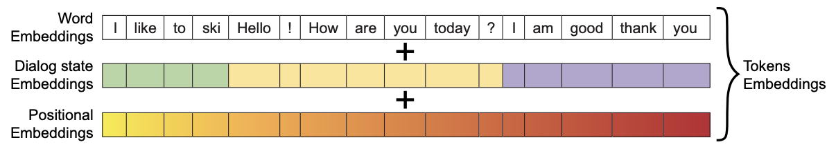 Fine-tuning : Fine-tuning은 PERSONA-CHAT dataset 으로 진행한다. Pre-training 과정에서는 단일 화자가 혼자 말하는 데이터인 반면, PERSONA-CHAT dataset은 두 사람이 대화하는 데이터이고, 두 사람의 profile을 명시하는 문장들도 함께 제공하기 때문에, 입력 방식에 있어서 변화를 주어야 한다. 입력은 단순하게 profile 문장들을 모두 연결하고 이후에 모든 대화 내용을 연결하는 방식으로 제공한다. 하지만, 이렇게 연결만 하는 방식으로는 어떤 문장까지가 profile이고, 대화 과정에서 어떤 문장을 어떤 화자가 한 것인가에 대한 정보가 없기 때문에 dialogue state embedding을 새로 추가한다. Dialogue state embedding은 현재 입력으로 제공되는 토큰이 profile 문장인지, 첫 번째 화자(PERSON1)의 문장인지, 두 번째 화자(PERSON2)의 문장인지를 구분해서 표시한다. 최종적으로 생성된 token embedding은 word embedding + dialogue state embedding + positional embedding 을 모두 더한 값으로 생성된다. 추가적으로, personality(profile) sentence의 순서가 결과에 영향을 주기 않도록 하기 위해서 모든 personality sentence에 동일한 positional embedding을 부여한다.