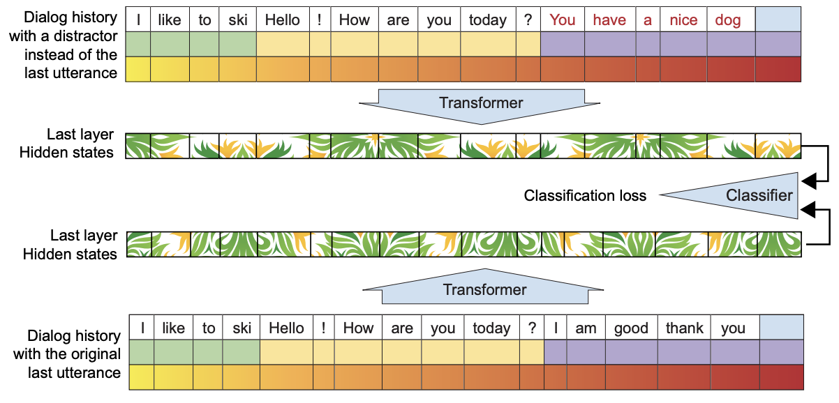 Multitask learning : 두 개의 손실 함수로 학습을 진행한다. 첫 번째는 next utterance classifiaction loss 이다. [그림-2]와 같이 정상적인 다음 utterence를 마지막에 append한 입력과, 잘못된 utterence(빨간색으로 표시된 글자)를 append한 입력 (2 ~ 6개) 중에서 정상적인 입력을 (장상적인 다음 utterance) 찾아내는 classification task이다. 제일 마지막에 classification을 위한 [CLS] 토큰(파랑 박스)을 사용해서 softmax layer를 통해 결과를 예측한다. 두 번째로는 language modeling loss 이다. Language modeling loss는 기본적인 cross-entropy loss로서 마지막 hidden state가 softmax를 통해 다음 생성될 단어를 예측한다. Negative log-likelihood loss를 사용한다.