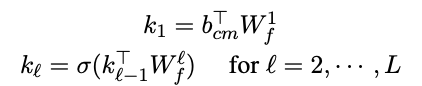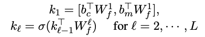 Dynamic-Context Generative Model 2 (DCGM-2) : DCGM-1은 $ c, m $을 구분하지 않고 하나의 벡터로 생성하기 때문에 $ c $ 와 $ m $ 사이의 관계를 무시하는 현상이 발생할 수 있다. 그렇기 때문에, DCGM-2에서는 각각 $ c, m $ 에 대해서 서로 다른 bag-of-words representation인 $ b_c, b_m $ 을 생성하게 된다. 두 representation이 각각 $ W^l_f $ 와의 연산을 통해 구한 벡터를 연결해서 $ k_1 $ 벡터를 구하게 되고, 해당 벡터는 DCGM-1 과 동일한 과정을 통해 연산을 수행하게 된다. 연산 과정은 [식-8]로 나타낼 수 있다.