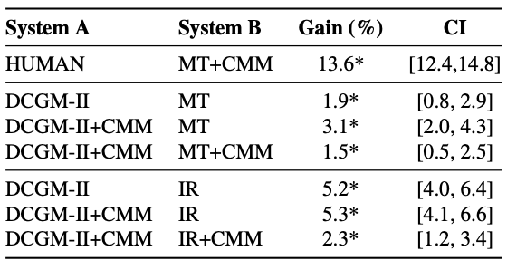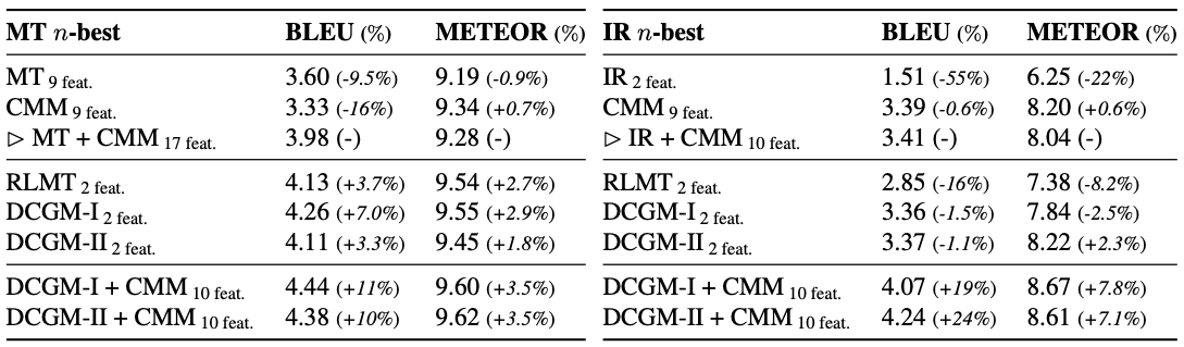 Response에 대해서 rescoring을 진행한다. 제안된 모델 (RLMT, DCGM-1, DCGM-2) 의 성능을 평가할 때, IR과 MT 방식을 사용해서 나온 결과 중 가장 좋은 n 개의 결과만 사용해서 성능을 평가한다.