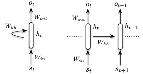 해당 모델은 총 3개의 weight matrix를 사용한다. $ \theta_{RNN} = <W_{in}, W_{out}, W_{hh}> $ 전체 vocabulary 의 크기가 $ V $ 인 경우, input matrix $ W_{in} $ 은 $ R^{V*K} $ 의 크기를 가지고 있으며, $ K $ 크기의 임베딩을 생성한다. Recurrent matrix $ W_{hh} $ 는 과거의 기록을 계속 유지하는 역할을 수행하는데, $ R^{K*K} $ 의 크기를 갖는다. Recurrent matrix는 임베딩을 입력으로 받아서 hidden state $ h_t $ 를 결과로 제공한다. 마지막으로 hidden matrix는 hidden state $ h_t $ 를 output $ o_t $ 로 생성하므로 $ R^{K*V} $ 의 크기를 갖는다. Hidden state를 생성하는 과정과, output을 생성하는 과정은 [식-2]와 같다. $ h_t $ 를 생성하기 위해서는 sigmoid 함수를 사용하고, $ h_0 = 0 $ 으로 지정한다.