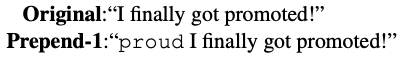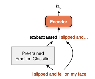 현재 존재하는 다양한 모델을은 특정한 task에 알맞게 pretrained 되어 있는데, 해당 학습 과정에 empathetic responding과 관련이 있을 수 있다. 이러한 관련성을 살리기 위해, 해당 논문에서 기본으로 사용하는 모델과 새로운 사전학습된 모델을 합쳐서 조금 더 좋은 성능을 낼 수 있을 것이라 판단했다. (이러한 과정은 추가적인 데이터나 추가적인 학습이 필요 없다는 장점도 있다.) 그래서 해당 논문에서는 2개의 사전 학습된 모델을 추가해서 실험을 진행했다. 첫 번째는 emotion detection 모델이고, 두 번째는 topic detection을 수행하는 모델이다. 이러한 사전 학습된 모델을 사용하는 방식 중 하나인 PREPEND-1 은 [그림-5]와 같이 표현할 수 있다. 동일한 입력을 사전 학습된 모델의 입력으로 제공하고, 해당 모델에서 결과로 나온 데이터를 인코더에 함께 입력으로 제공하는 것이다. Emotion detection 모델을 예로 들어보면, ([그림-6]) 입력으로 해당 문장이 제공되는 경우, emotion detection 모델에서는 해당 문장을 기반으로 감정을 구분하고(proud) 해당 결과를 실제 인코더에 입력으로 제공할 때 기존의 데이터 앞에 prepend 하는 방식이다. 그래서 해당 논문에서는 EMOPREPREND-1 과 TOPICPREPEND-1 이라는 두 모델을 사용하게 된다.