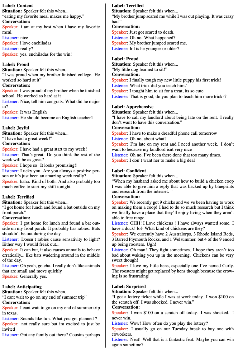 아직까지는 empathy를 기준으로한 dialogue generation의 benchmark가 존재하지 않기 때문에 더 의미있다고 할 수 있다. ED를 구성하는 모든 대화는 특정한 상황을 기반으로 하고 있다. Speaker는 해당 상황에 대한 감정이 정해지고, 해당 감정에 대해서 1대1 대화를 나누게 된다. 감정을 예측하는 다양한 데이터셋이 기존에 존재하지만, ED는 더 큰 규모와 더욱 다양한 감정을 담고 있다. [그림-2]은 ED를 구성하는 데이터 중 일부이다.