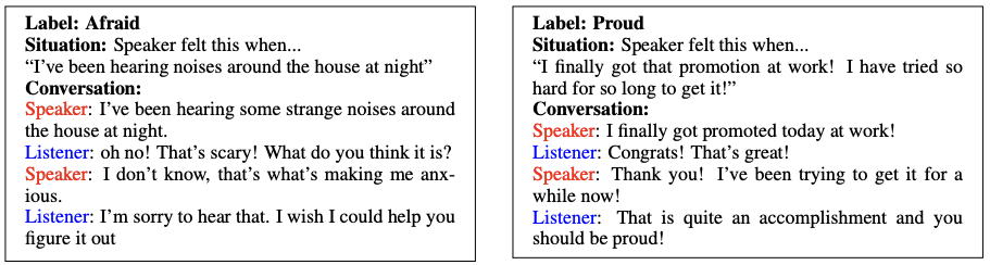 Dialogue agent가 대화를 하는 상대의 감정을 파악하고, 그 감정에 알맞는 대화를 제공하는 것을 상당히 중요한 요소이다. 이번 논문에서는 empathetic dialogue generation이 가능하도록 학습할 수 있는 EMPATHETICDIALOGUES(ED) 라는 데이터셋을 제안한다. 25K개의 대화로 구성되어 있고, 각 대화는 특정한 감정/emotion을 기반으로 하고 있다. 해당 데이터셋으로 학습하는 경우, 대화하는 상대의 감정을 더 고려해서 알맞는 응답을 제공할 수 있다고 주장한다. [그림-1]을 보면, Listener가 생성한 두 응답 모두 대화에는 적합하다고 할 수 있지만, 상대방의 입장과 감정을 고려한 경우, 두 번째 응답을 사용하는 것이 적합하다는 것을 판단할 수 있다.