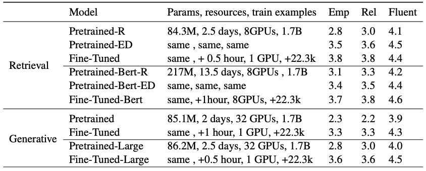 학습 과정 : 모든 모델을 1.7 billion Reddit conversation에 대해서 사전학습을 시켰다. ED 에 대한 finetuning을 수행하지 않은 경우, Pretrained 모델이라고 칭하게 된다. ED로 추가적인 학습을 진행하는 경우, 우리가 최종적으로 원하는 empathetic response를 생성할 가능성이 높아지기 때문에, ED로 추가적인 학습을 진행하지 않더라고, inference time에 사용되는 응답 후보에 ED의 응답을 추가해서 함께 학습하는 경우도 고려하게 된다. ED에 대해서 추가적인 fine-tuning을 수행한 경우, 해당 논문에서는 Fine-tuned 모델이라고 부르게 된다. Transformer 모델에 대해서는 300-차원의 임베딩을 사용해서 common-crawl의 데이터로 사전 학습을 진행했다. BERT 모델의 경우, 768-차원의 임베딩을 사용했고, BooksCorpus, EnglishWikipedia로 사전학습을 진행했다.
