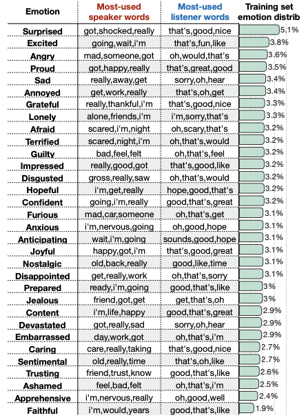 EmpatheticalDialogues(ED) 데이터셋은 open-domain 대화 방식으로, 1대1로 대화를 진행한다. 대화는 두 사람 중 한 사람이 처한 상황에 대해서 이루어진다. 해당 데이터셋은 [그림-3]에서와 같이 총 33개의 감정을 다루게 된다. 각 감정에 대한 데이터는 최대한 균등하게 유지할 수 있도록 제작했다. 특정 상황이 한 개의 감정에 해당될 수도 있지만, 어떠한 경우에는 여러개의 감정이 복합적으로 해당되는 경우도 발생하게 된다.