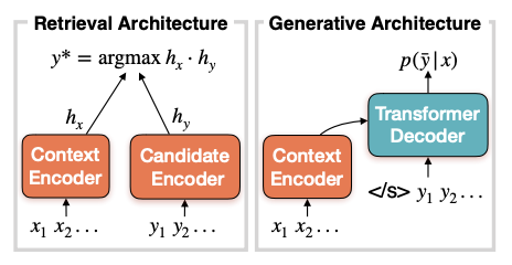 Retrieval-based model : 해당 모델에서는 전체 후보 응답 $ Y $ 중에서 최적의 해답 $ y^* $ 를 찾아내는 문제이다. 두 개의 서로 다른 Transformer encoder를 학습한다. 첫 번째 인코더에서는 context $ x $ 에 대한 인코더 역할을 수행하고, 두 번째 인코더에서는 후보 응답 $ y $ 를 인코딩하는 역할을 수행해서 각각 $ h_x, h_y $ 의 인코딩을 생성해내게 된다. 추가적으로 BERT 를 사용한 모델도 구축했다. BERT의 마지막 hidden vector를 각각 $ h_x, h_y $ 으로 사용하게 된다. Context를 기반으로 제일 좋은 후보 응답을 찾아내는 방법은 단순히 $ h_x, h_y $ 의 dot product의 결과에 softmax 함수를 사용하는 방식으로 구하게 된다. Inference time에서는 3개의 데이터셋에서 후보 응답을 추출해서 사용하게 되는데, 데이터셋은 각각 ED training set, DailyDialog training set, Reddit conversation으로 구성된다.