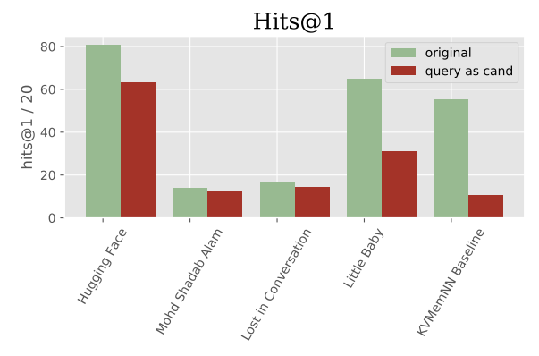 두 번째로는 last utterance distractor를 사용한 실험이다. 응답을 생성하기 전에 마지막으로 받은 상대방의 문장을 Hits@1 을 평가할 때의 보기에 추가했다. 가끔 모델들이 상대방의 말을 그대로 따라서 말하는 경우가 발생하기 때문에 이러한 실험을 진행하게 되었다. 실험 결과는 [그림-3]과 같다. 몇 모델들의 성능이 현저하게 떨어지는 것을 확인할 수 있었다.