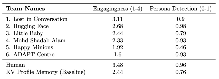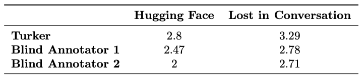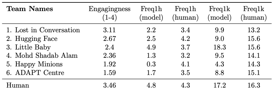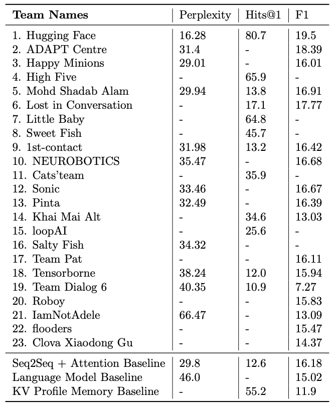 Hugging-face 팀이 automatic evaluation metric에 대해서 가장 좋은 결과를 제공했다. 하지만, 최종 우승은 Lost in Conversation 팀이 가져갔다. 최종 결과에서도 Hugging face 팀이 2등을 차지한 것으로 보아, 실제 사람이 평가한 기준과 automatic evaluation metric에는 어느정도 상관관계가 있다는 것을 알 수 있다.