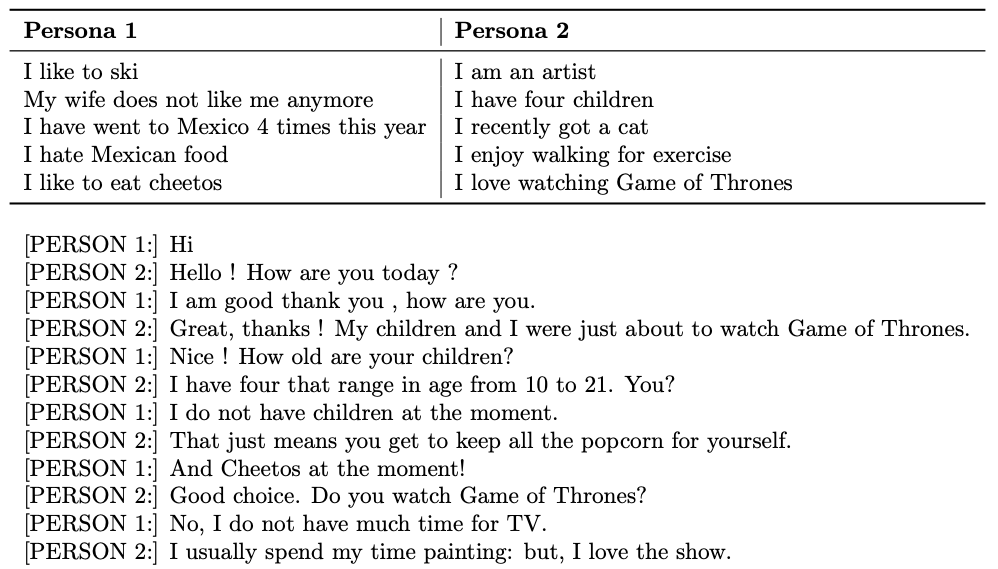 PERSONA-CHAT 데이터셋에 대해서 간단하게 알아보면, 두 사람이 대화를 나누는 데이터셋이다. ([그림-1] 참고) 기존의 대화 데이터셋과의 차이점은 두 사람의 대화 내용과 함께 각 사람의 특징/성격(persona) 들이 몇 개의 문장으로 정의되어 있다. 대화에 참여한 두 사람은 서로 질문하고 대답하면서 서로에 대해서 알아가는 과정을 거치게 된다. 이러한 과정에서 대화에 참여한 각 사람은 자신의 persona를 대화하는 동안 꾸준하게 유지해야 한다. 이러한 데이터셋으로 학습하게 되면, 해당 모델은 조금 더 consistent하고 engaging한 응답을 생성해낼 수 있다. 총 1155개의 서로 다른 persona 가 정의되어 있고, 각 persona는 최대 5개의 문장으로 구성되어 있다. Validation 데이터에는 한 번도 학습하지 않은 100개의 persona가 포함되어 있다. 가끔 명시된 persona를 그대로 사용하거나 word overlap 을 기반으로 응답을 생성하는 경우가 발생가히 때문에, 추가적으로 기존의 문장을 다른 말로 rewrite해서 구축한 데이터셋도 추가했다. 데이터셋에 대한 수치는 [표-1]과 같다.