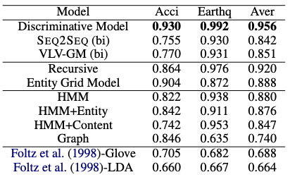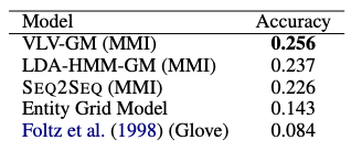 Baseline : Entity Grid Model, Li and Hovy(2014) 방식(recursive model), Foltz et al. (1998) 방식 + GloVe, LDA vectors