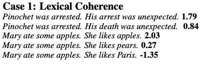 해당 모델을 lexical coherence를 분석할 수 있다는 것을 확인했다. 두 번째 문장이 첫 번째 문장과 상관이 없는 경우 더 낮은 점수를 부여했다.