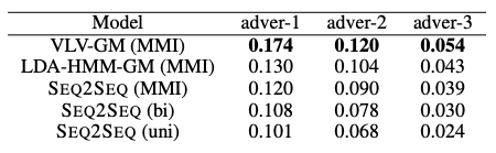 Adversarial evaluation : generative model을 이용해서 multi-sentence generation을 수행한다. N 개의 문장을 생성하는데, 첫 번째 문장을 생성하기 위해서 처음에 제공된 문장을 사용하고, 두 번째문장을 생성하기 위해서는 기존에 제공된 문장과 첫 번째로 생성한 문장을 함께 사용한다. 3번 째 문장을 생성할 때도 동일하게 처음에 제공된 문장과 함께 첫 번재, 두 번째로 생성한 문장들을 모두 고려해서 생성하게 된다. Adversarial evaluation을 수행하는데, 단순하게 생각하면 그냥 binary classification 이다. 모델이 생성한 문장을 classifier가 사람이 생성했는지, 모델이 생성했는지 구분하게 되는데, 모델의 역할을 자신이 생성한 문장을 classifier가 사람이 생성했다고 분류하도록 하는 것이다. Adversarial Success(AdverSuc)을 [표-4]에 결과로 제공한다. 문장을 생성하는 횟수가 늘어날수록(N의 크기가 커질수록) 성능이 떨어지는 것을 확인할 수 있다.