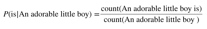 count 기반의 접근 : 단순히 시퀸스를 구성하는 단어들이 몇 번 등장하는지를 count 해서 count 값을 기반으로 조건부 확률을 구하는 방법이다. 예를 들어, "An adorable little boy" 라는 시퀸스가 현재 주어졌을 때, 다음 단어가 "is" 일 확률 $ p(is|An adorable little boy) $ 를 구하는 방법은 [식-1]과 같다.