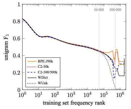 Vocabulary 집합의 크기가 성능에 어떠한 영향을 주는지 확인하기 위해 C2-3/500k 를 구축했다. 동일하게 bigram을 사용하지만, 집합의 크기가 훨씬 커졌다. [그림-2]와 [그림-3]은 각각 English-German, English-Russian 데이터셋에 대해서, rare word에 대한 unigram F1 점수를 나타낸다. 더 자주 나타나지 않는 단어일 수록, 성능을 떨어진다는 것을 확인할 수 있다. WDict의 성능이 WUnk의 성능보다 좋고, WDict의 성능보다 C2-3/500k의 성능이 더 좋다는 것을 확인할 수 있었다. Subword representation은 less sparse하기 때문에 vocabulary의 크기를 줄일 수 있고, 더 많은 단어들을 표현할 수 있기 때문에 더 좋은 성능을 제공할 수 있다. Subword model은 oversplitting을 해도 번역을 수행할 수 있고, transliteration도 수행할 수 있다.
